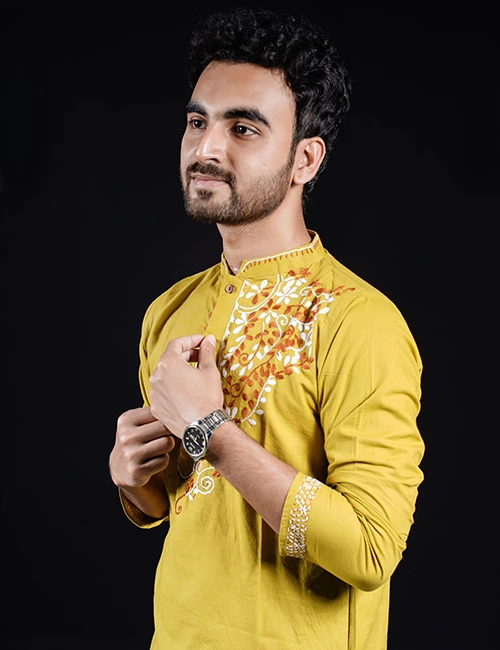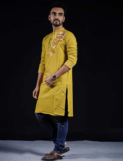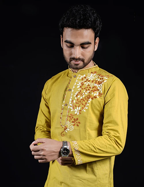 Fabric: High-quality cotton fabric for a comfortable fit Color: Elegant olive – a natural and refined look Embroidery: Exquisite hand embroidery for an artistic touch Fit: Modern cut and tailored design for a stylish appeal Ideal for: Weddings, Eid, Puja, parties, and formal events Sizes Available: 40, 42, 44